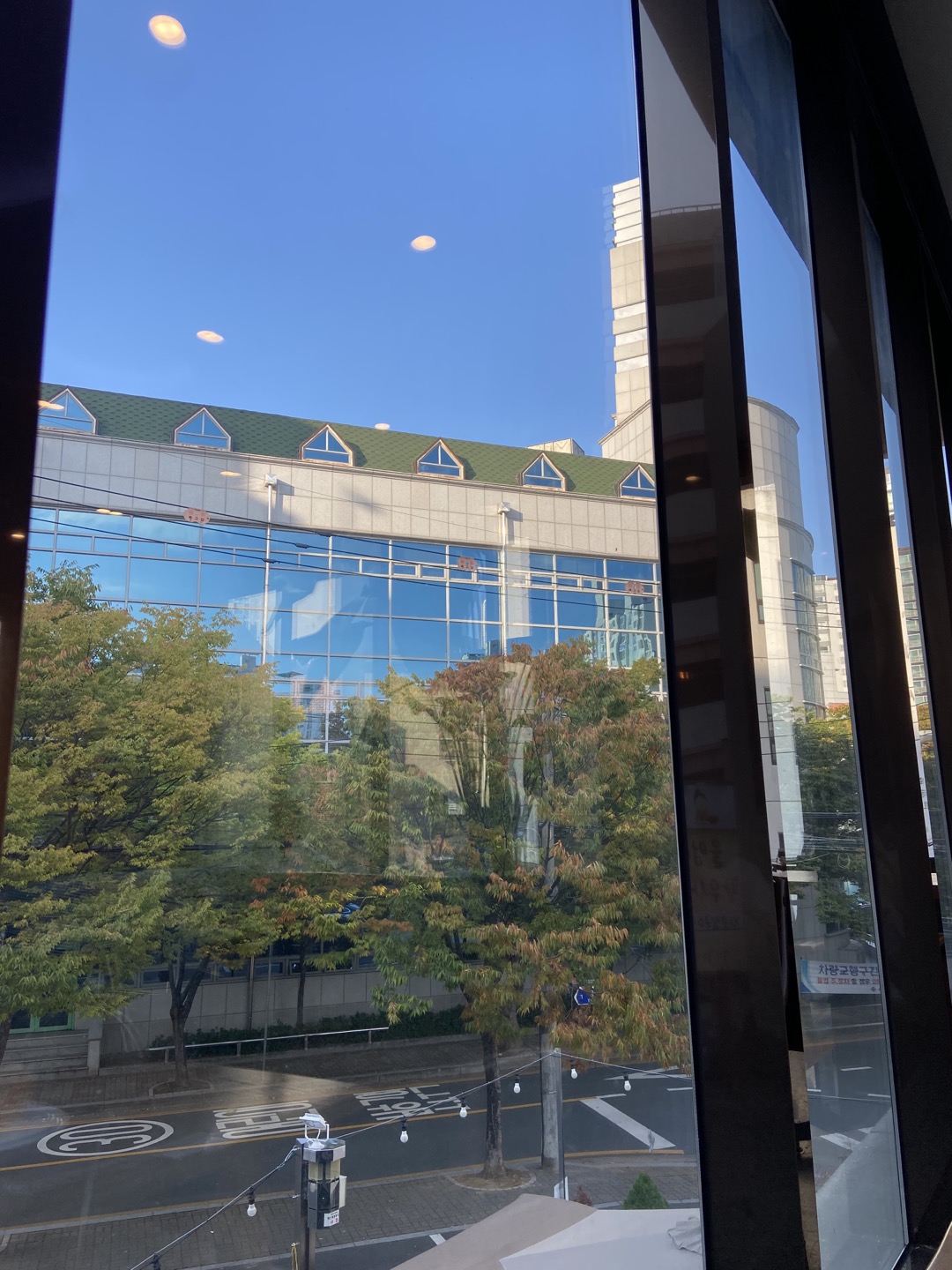 마당도 있고, 통창 뷰에( 교회뷰 ㅋ), 포장해온 초코빵이 맛있어.
