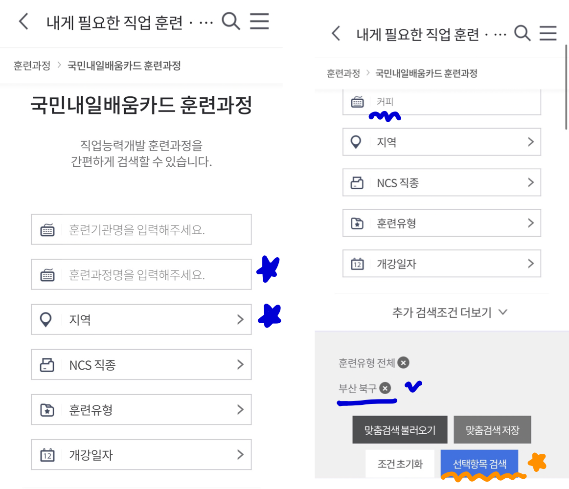과정명에 '커피' 그리고, 지역만 선택했습니다.