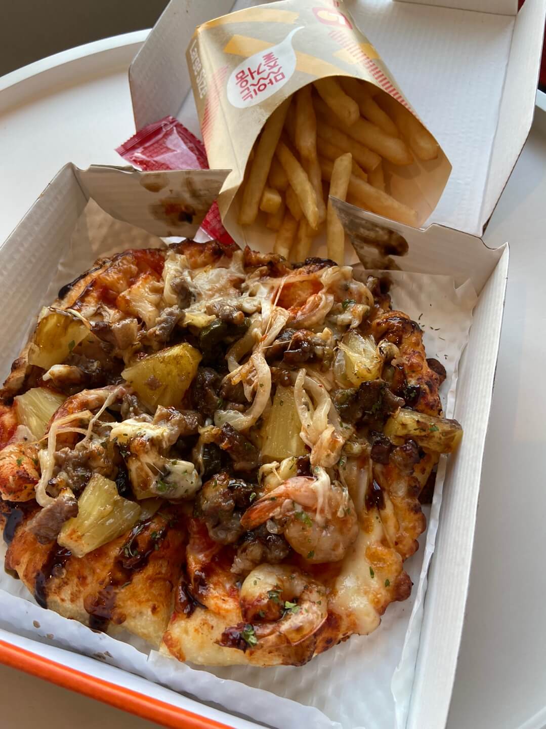 배가 고파서 밥을 먹지 않고 먹고 싶어서 먹는다. 그런데 피자랑 감튀가 너무 맛있었다.