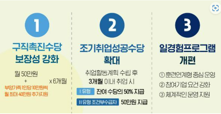 1.구직 중 최소ㅏ한의 생활 안정을 위해 최대 300만원 (월 50만원 X 6개월)