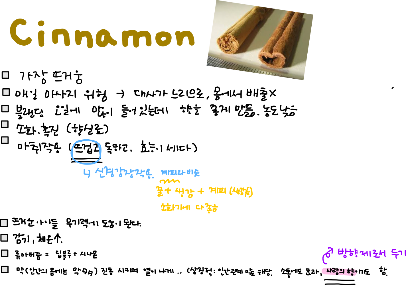 도테라 오일에 관한 사람들의 관심이 높아, 따로 카테고리를 만들었어요. 제가 자격증 공부할때 했던 메모들이니 도움이 많이 되셨으면 합니다. 오늘은 시나몬에 대해서 알아보아요. 시나몬키워드 : 내면지향 ( 소통과 관계) 막을 진동시켜 열이 나게 하는 시나몬은 위장을 따뜻하게 하여 소화애 좋고 사람과의 관계에도 따뜻하게 작용하여 관계의 막을 없애는데 도움이 준다. 요즘에는 시나몬 스틱도 시중에 나와있는데요 회사에서 관계로 힘드신분들은 책상위에 올려두시거나 약간 티안나게 발향하거나 시나몬이 들어간 음료를 함께 마셔보는등 실생활에서도 잘 활용해 보시기 바랍니다.^^